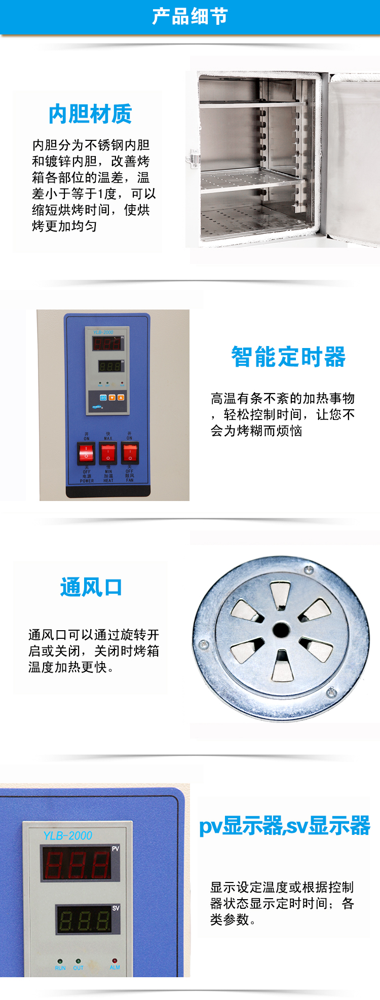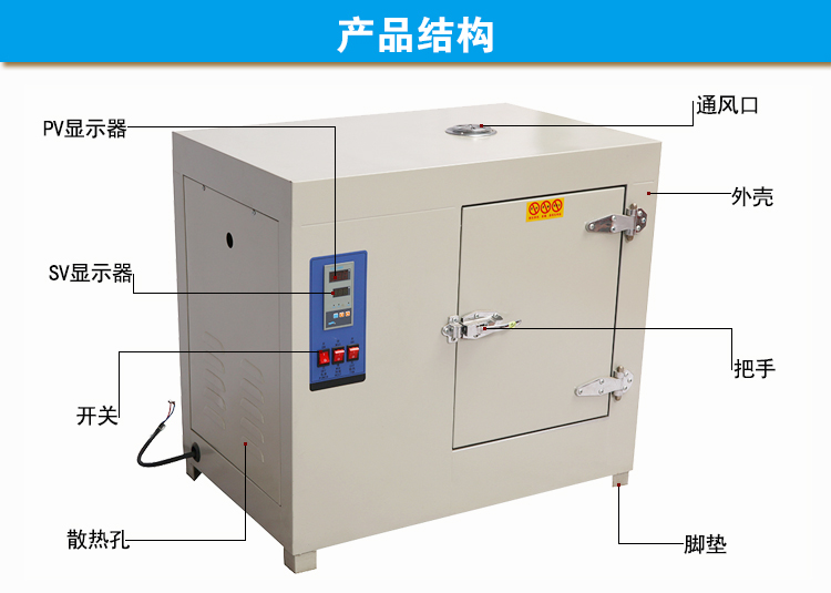 本品工作室下部装有发热丝,左侧装有鼓风装置,温度控制仪控制温度恒定及高低,工作时空气由箱底进气