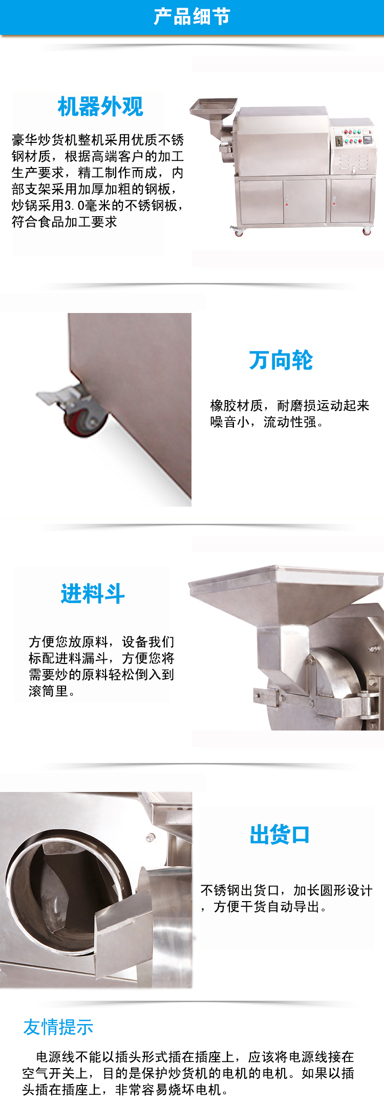 度的需求,所炒的食品口感好。达到节电又省时的效果。 6.在炒货过程中,所炒物料在滚筒内立体翻炒不粘锅。