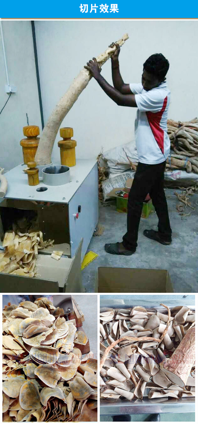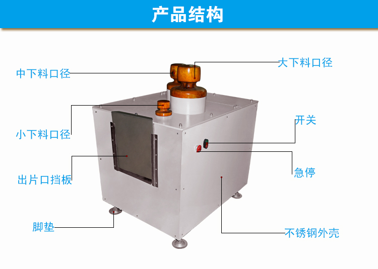 料:将木质压模取出,调整好切片厚度,开启机械后,将物料放入进料口中即可