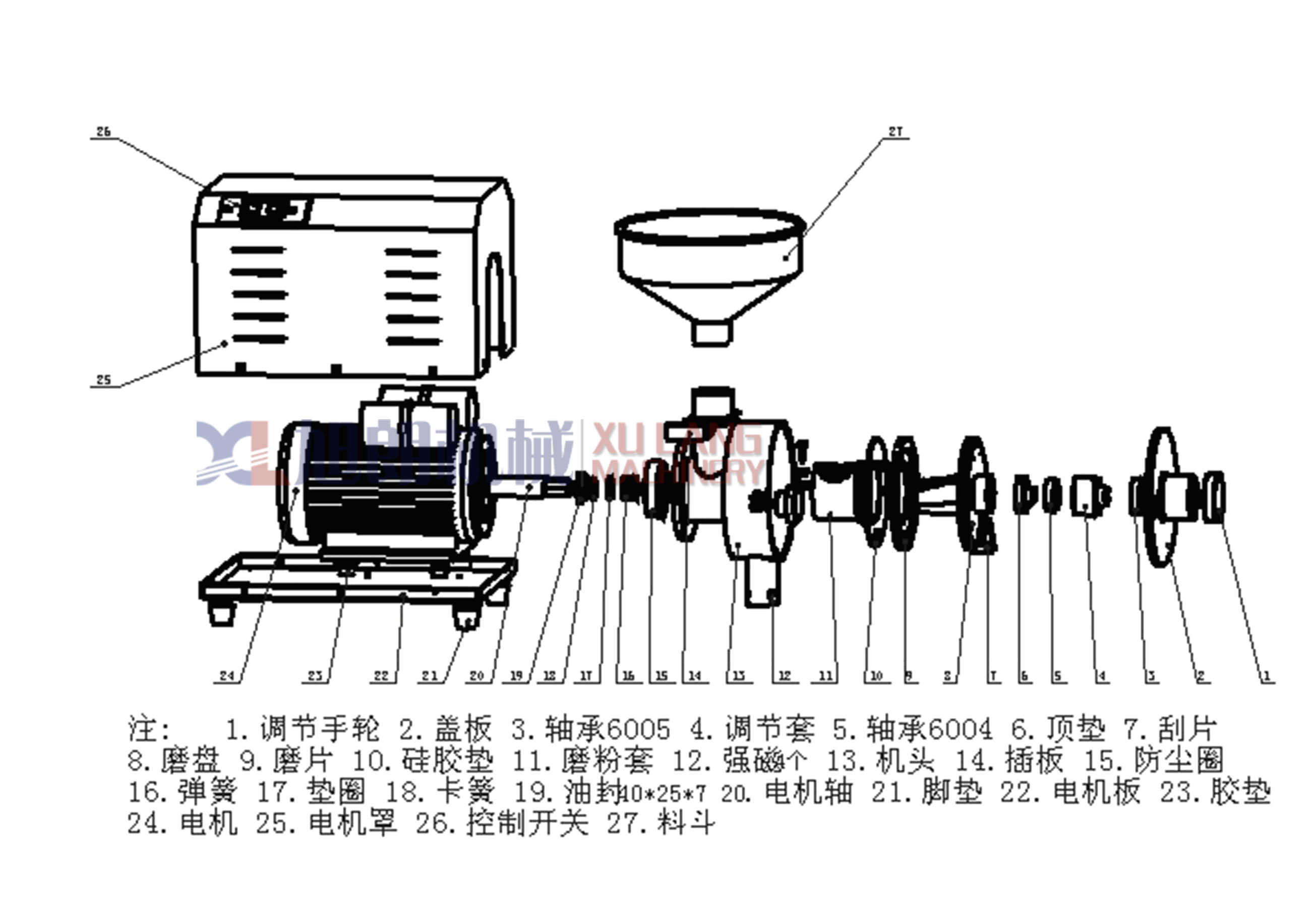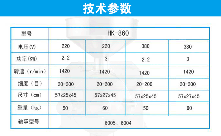 HK-860乐玩首页(中国)网页版分解示意图 ![]() ![]() ![]() ![]() 一.860乐玩首页(中国)网页版优势说明: 1、 860磨粉机不再采用低功率电机,220V有2.2和3KW两个功率,380V仅有2.4KW一个功率。新款磨粉机的电 2、 静磨片与机壁之间加装了硅胶垫,起到减震、微调磨片的效果,使两块磨片吻合更好,磨粉更细,噪音减弱。 3、 860磨粉机,电机与电机固定板之间,电机固定板底下,均加装橡胶垫,进一步加强减震和降噪效果。 4、 860磨粉机门盖和腔体之间,采用紧密加工方式,以台阶位配合方式,确保不漏粉,确保调节器顶垫和磨 5、 860磨粉机的粉碎腔坡度(即静磨片安装位),采用科学设计,进一步保证了磨粉的细腻度,达到进口即 6、 860磨粉机的调节器槽牙,采用高级机械加工中心,确保加工精密度,达到了方便调节、配合紧密、噪音 7、 磨粉机的磨盘装上磨片和刮片后,经过电脑动平衡检测,进一步保证了同心度和重心的平衡度, 8、860磨粉机的底座和电机之间没有轴承,便于客户拆装,又减少了故障发生,提升了机器品质。 9、磨粉机达到了出料顺畅、磨粉非常细腻、噪音和震动比老款小很多的效果。 860磨粉机,每台均配送价值200元的大礼包,含2副磨片(机器上本身自带1副)、不锈钢下料棒1根、 磨粉机的电机启动运转时,连接轴以及套在连接轴上的磨盘一起运转。待磨物料从料斗进入磨粉套,磨盘 三.技术参数 四.操作与调整 1、磨粉机应放置在水平、固定、结实的水平桌面或者台面上,厚实木更佳。 2、由于磨粉机电机在工作后会不断产生热量,所以磨粉机应放在宽敞通风处,有利于散热降温。如果 3、将机盖打开,再将磨盘固定在连接轴上,再用两个大拇指按压在磨盘上,如果磨盘能够自由伸缩,说 4、启动电源,运转1分钟左右,将物料放进料斗,将调节器拧至适当位置,打开下料挡板,使物料缓慢地 5、 磨粉的粗细取决于两块磨片之间的间隙,而磨片的间隙靠调节器进行控制,根据机盖上的粗细指示, 6、调节器的调节范围和力度该如何控制,可以通过耳朵听磨片摩擦产生的声音以及电机运转的声音来决 7、单独磨含油量特别高的物料如芝麻、核桃、花生等,因为这类物料的含油量特别高,只能磨成粗粉, 8、动磨片和静磨片的装卸:装在磨盘上的为动磨片,装在粉碎腔的为静磨片。将固定磨片的3枚螺丝取下 五.注意事项 1、使用前详细阅读使用说明书,严格按照操作规范操作机器,每次开机前,应检查静磨片、动磨片、刮片 2、磨粉机一定要外接断路保护(过载保护)装置,以保护电机和人身安全。 3、加工五谷杂粮、中药材等,应先烘干或烘熟,清除石块、金属等杂物。物料受潮变软或者发粘后,应该 4、每次使用机器结束后,应将机器内部清理干净,不得用水直接冲洗,并通风晾干。 5、严格按照规定接地线,电机应以逆时针方向运转,机器正常运转无异常、无异动、无异响时,方可操作 6、磨粉机需固定在牢固稳定水平的桌面和柜台上,才能最大地减轻震动和噪音。 7、在加工过程中,如因停电等原因突然停机,必须先关闭电源开关,再清除粉碎腔内的残余物料后,才能再 8、如发现机器零件有严重磨损或损坏时应及时进行修理或更换。 9、机器启动后,应待运转正常时才能放料加工,注意控制进料量,防止电机超载闷机。 10、机器较长时间不用时,应切断外电源,机器勿到置,要平放,上面不要放重物。 11、本机保修一年,人为使用不当引起的损坏,以及正常磨损,不属保修范围。需返回销售单位或者厂家进行 六.操作方法和技巧 (一)、操作方法 1、机器每天使用前必须检查机器是否运转正常、静磨片和动磨片的螺丝是否有松动,并加以拧紧。 2、磨干性材料 磨干性材料是需要磨两次,第一次粗磨,第二次细磨。 第一次粗磨时,调节调节螺丝至磨片有轻微的吱吱摩擦声音,再往粗回调节到刚刚没有摩擦声,然后打 3、磨干性加油性混合材料 方法一 磨干性加油性混合材料时需要磨两次,第一次粗磨,第二次细磨。 第一次粗磨时,调节调节螺丝至磨片有轻微的吱吱摩擦声音,再往粗回调节调节螺丝一圈,然后完全打开 第二次细磨时,调节调节螺丝至磨片有轻微的吱吱摩擦声音再打开下料口插版1/4-1/3即可。 方法二 第一次将干性材料细磨(与磨干性材料操作方法一样)。 第二次将已经磨好的干性材料与油性材料混合均匀,在调节调节螺丝至磨片有轻微的吱吱摩擦声音,然后 4、磨含糖份高的材料 磨含糖份高的材料时,(比如红枣、金桔片、枸杞等等)糖份高的材料需烘焙干,去水份,或速冻两个小时 5、磨含糖份高的混合材料,操作方法和磨干性加油性混合材料操作方法相同。 (二)、更换磨片 1、拆下旧磨片(磨片有正反面,静磨片和动磨片可以调换使用)。 2、安装好磨片,调整磨片内孔与粉碎套或动磨盘安装位置的缝隙均匀再拧紧螺丝。 3、调节磨片的平整:开启机器,调节调节螺丝至磨片发出非常刺耳的声音,运行20-30秒钟左右,停机打开 (三)、磨合磨片 1、取2-3斤大米放入漏斗,启动机器调节调节螺丝至磨片刚刚有轻微的吱吱摩擦声音,再往细调节调节螺丝 七.常见故障及排除方法 故障现象 故障原因 排除方法 电机不能启动或启动困难 导线直径小,电压过低电容损坏 更换适当导线待恢复电压后再启动 电机无力 温度台高 电机绕组短路或电机轴承损坏,长期超负荷运转 检修电机,更换电机轴承,按额定负荷工作或暂停 机身发生 强烈