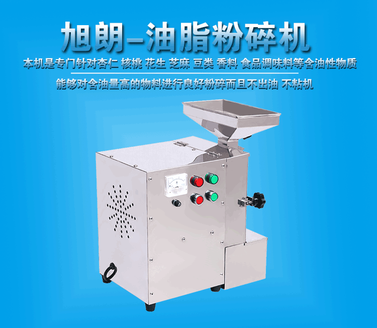 本机是专门针对杏仁、核桃、花生、芝麻、豆类、香料、食品调味料等含油性物质在粉碎和磨粉时容易出油、粘机的