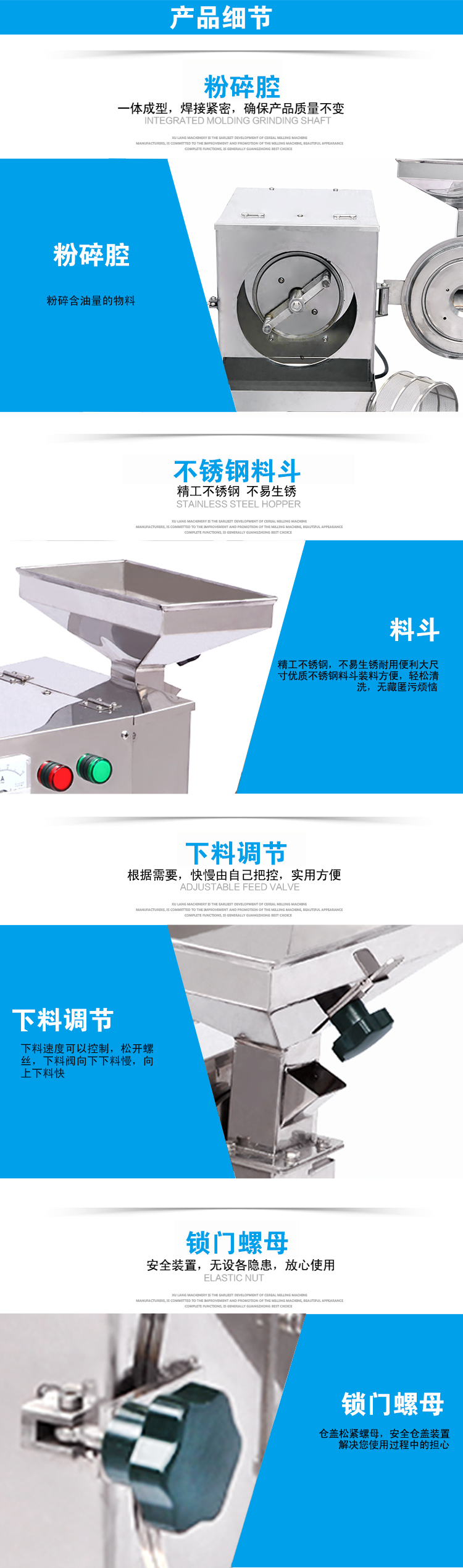 1、机器外壳与粉碎槽均为201不锈钢材质经过抛光研磨处理,符合美观与卫生标准。适合食品厂、加工店、商场、